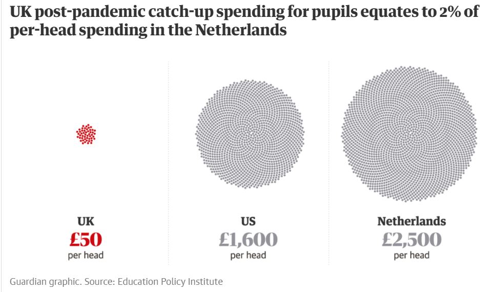 What Sir Kevan Collins showed the government was that a world class education system isn’t cheap. Other countries have realised this. In the Netherlands, the government has announced additional funding to support post-pandemic education recovery at around £2500 per child. In the USA, additional funding is running at £1600 per head. The graphic above shows that the UK government’s investment sits at just £50 per head, and even adding in previous education funding announcements only brings it up to £310 per head (as shown in the Financial Times.) As Geoff Barton said on Sky News: “what is it about those children in the Netherlands or the USA that makes them worth more?”