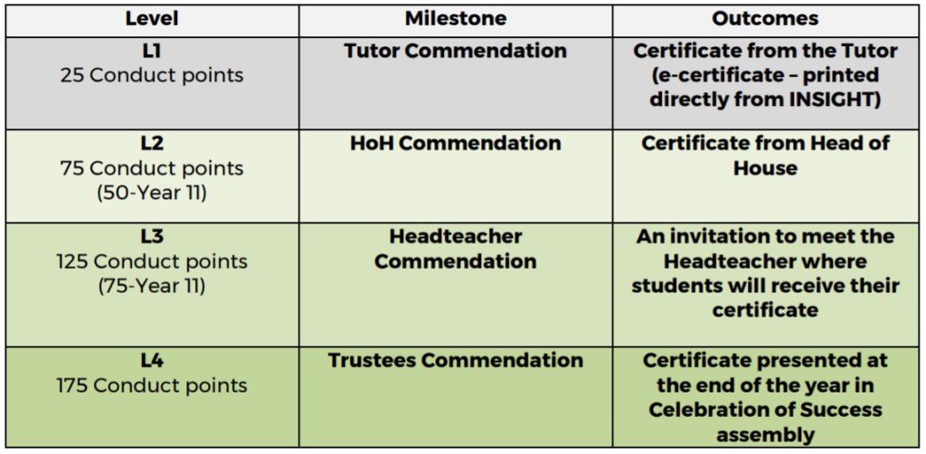 A Headteacher’s Commendation is awarded when a student has amassed 125 conduct points in a single academic year. Conduct points are the sum of reward points (positive) and concerns (negative). We always want to see students with positive conduct points scores, as this shows their rewards outnumber their concerns – but the higher the positive score, the better!